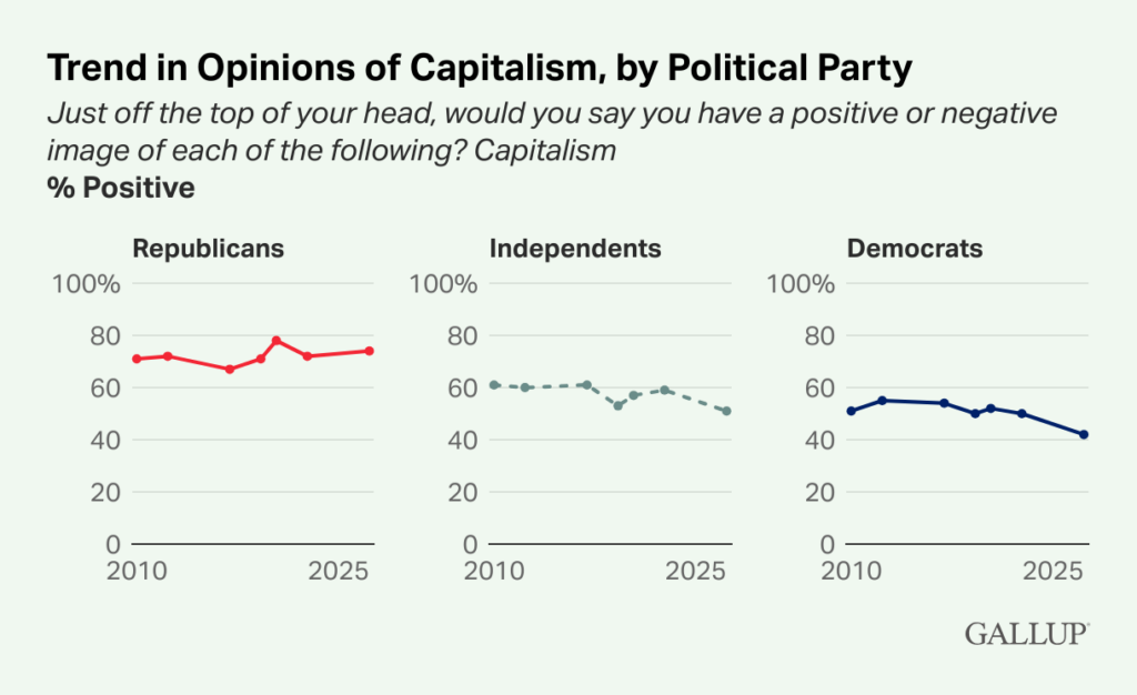 The partisan breakdown is even more revealing. Republicans remain strongly pro-capitalist, though support has softened slightly. Independents now only narrowly favor capitalism. And among Democrats, fewer than half view capitalism positively, while nearly two-thirds view socialism favorably. As earlier Gallup polling on capitalism and socialism shows, this pattern has been developing for years.
