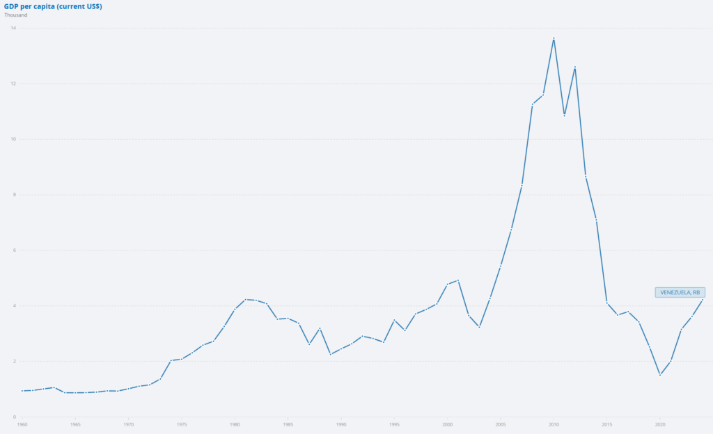 GDP per capita in Venezuela, 1960-2024. World Bank data.